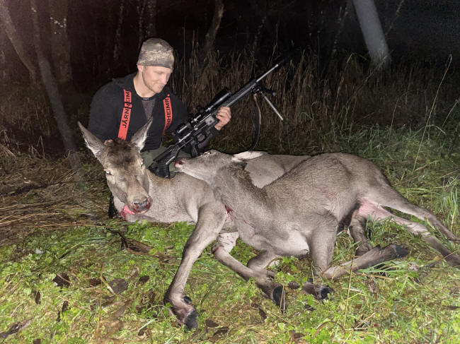 | Eirik kom på sitt andre besøk denne hausten og dyr på han blei det denne gangen og. Eirik og Ove installerte seg i Vetleløa og det skulle ikkje ta så altfor lang tid før Ove såg fem dyr i skogen rett over vegen opp til øvste Supphella men desse hadde all verdens tid og blei ståande i tette. men så ei stund etter kom det kolle og kalv gåande rett under desse og dei gjekk rett utpå marka. Dermed datt kalven og ein minutt etterpå så datt kolla. |