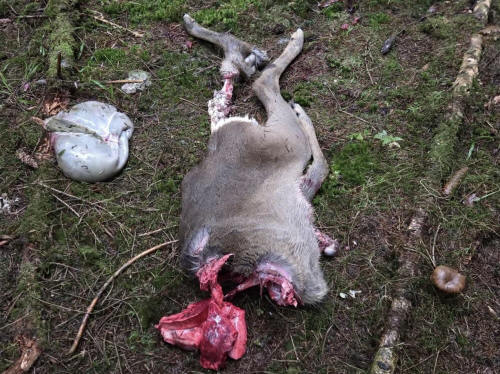 Eit rådyr nettopp drepe av gaupe, det hadde nok skjedd same morgonen eller natta før me skulle jakte. Det virkar som om gaupebestanden har auka ein del der me jaktar, det vart funne fleire gaupedrepte i området. |